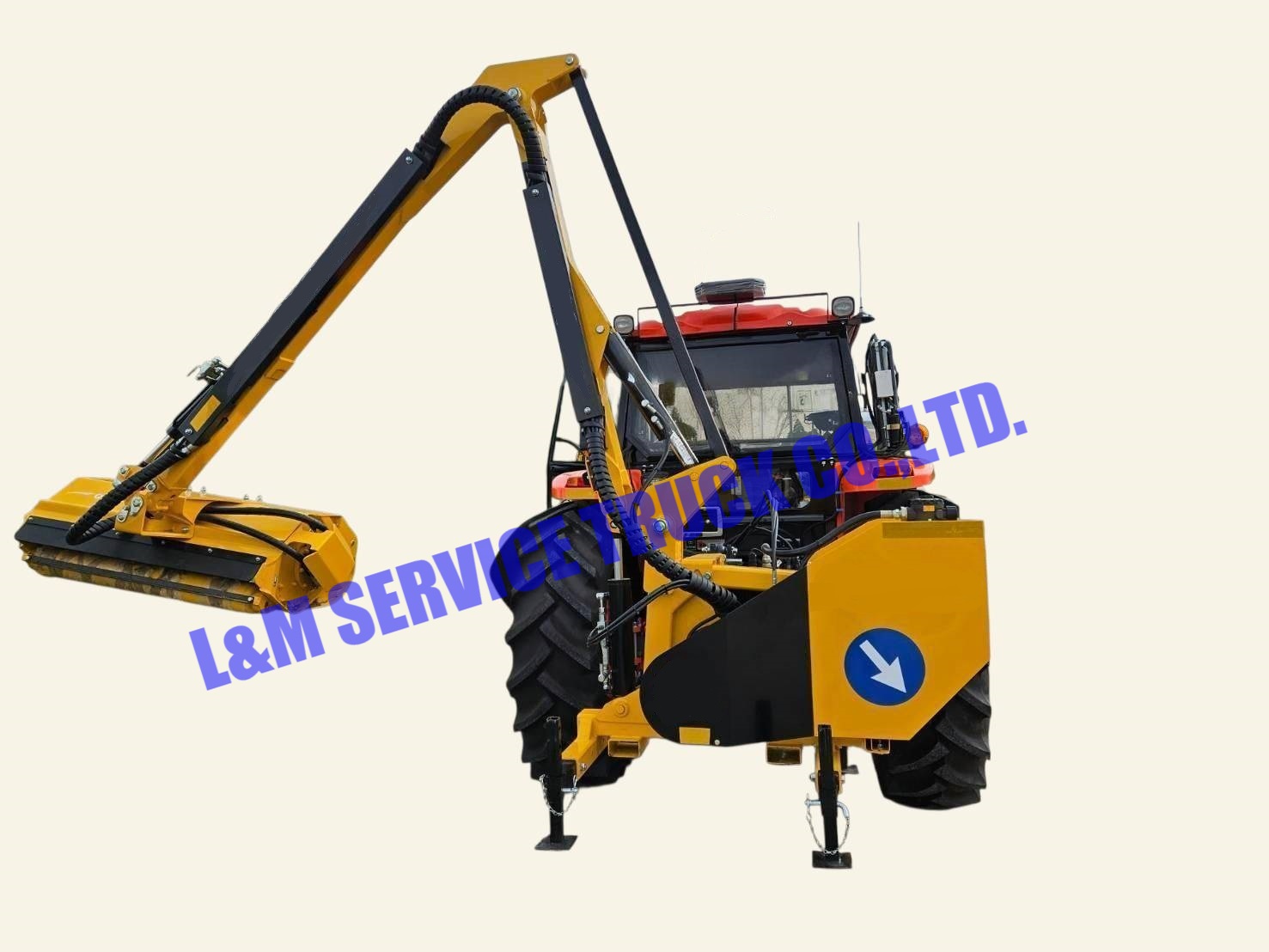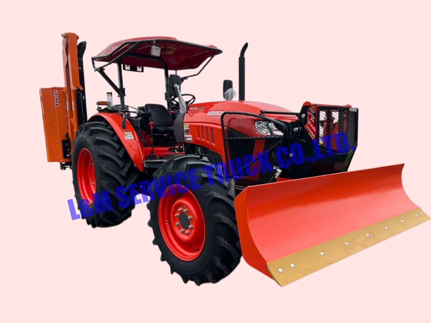 รถฟาร์มแทรกเตอร์ ติดตั้งชุดใบมีดดันดินหน้า และเครื่องตัดหญ้าไหล่ทาง